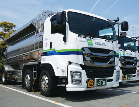 主力はタンクローリー車による危険物、高圧ガス、粉体樹脂等のトラック輸送。高砂ではお馴染みの黄緑と紺のライン、三晃グループはこの高砂通運から始まりました。高砂通運は輸送を単なるモノの運搬ではなく、お客様とお取引先を1つのラインとして繋げる重大な責務を担っていると考えます。ドライバーの使命と役割を何よりも重視し、現場の人材教育に注力し、高品質の輸送サービスを提供しています。